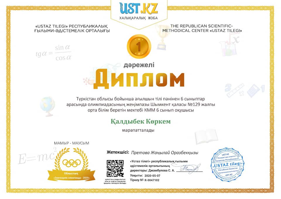Шымкент қалалық білім басқармасына қарасты, Әл-фараби ауданы №129 жалпы орта білім беретін мектебінен ағылшын тілі пәні бойынша «Ustaz tilegi» Республикалық ғылыми-әдістемелік орталығының мамыр айында өткізілген халықаралық, республикалық және облыстық пәндік олимпиадасына қатысып, жүлделі орындарына ие болды. Ата айтып тұрғандай әрине ұстаздың бар тілегі оқушыларының озат болуы, қылмыс атаулыдан аулақ болуы. Сол үшін де ұстаздар қауымы тер төгіп жүр. Ұстаздарының сол үміт үдесінен шыққан оқушылары, атап айтсақ: 5 сынып оқушысы Мергенбек Гүлзат I орын, 6 сынып оқушылары Қалдыбек Көркем I орын, Сүйерқұлова Балғын II орын иеленді. Жетекшілері Претова Жаңылай Оразбекқызы мұғалімдер арасында өткен халықаралық республикалық және обылыстық олимпиадалардан жеңімпаз атанып, дипломдармен және жеңімпаздарды дайындағаны үшін алғыс хатпен сонымен қатар ашық сабақ материалдарын жариялағаны үшін сертификатпен марапатталады.